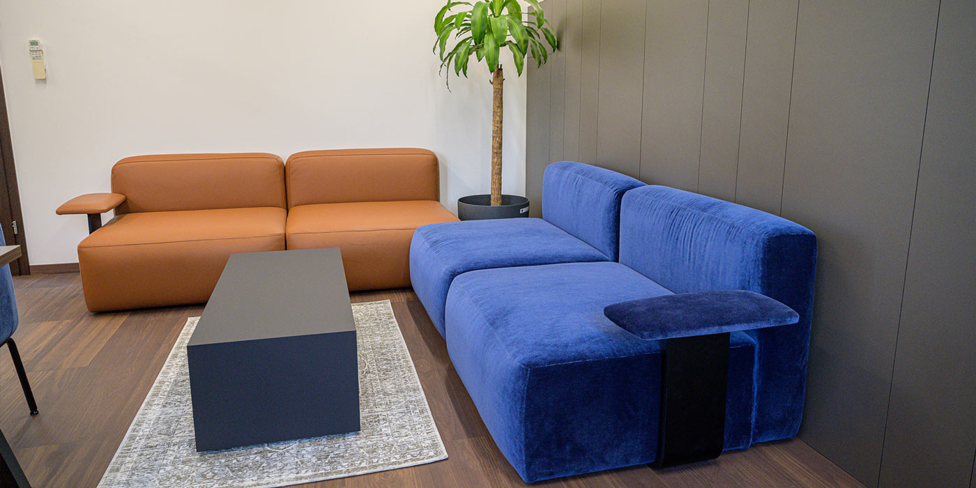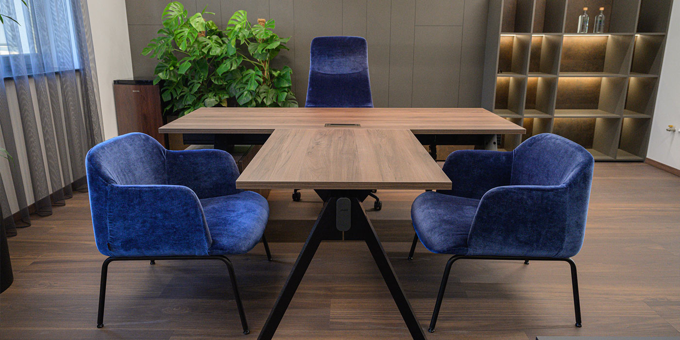 - Atypový manažérsky stôl VIGA: Upravený na mieru, doplnený sedením od Deep Lounge a manažérskym kreslom Aventador od Quinti v prémiovej látke Velluto Decontracté by Rubelli.