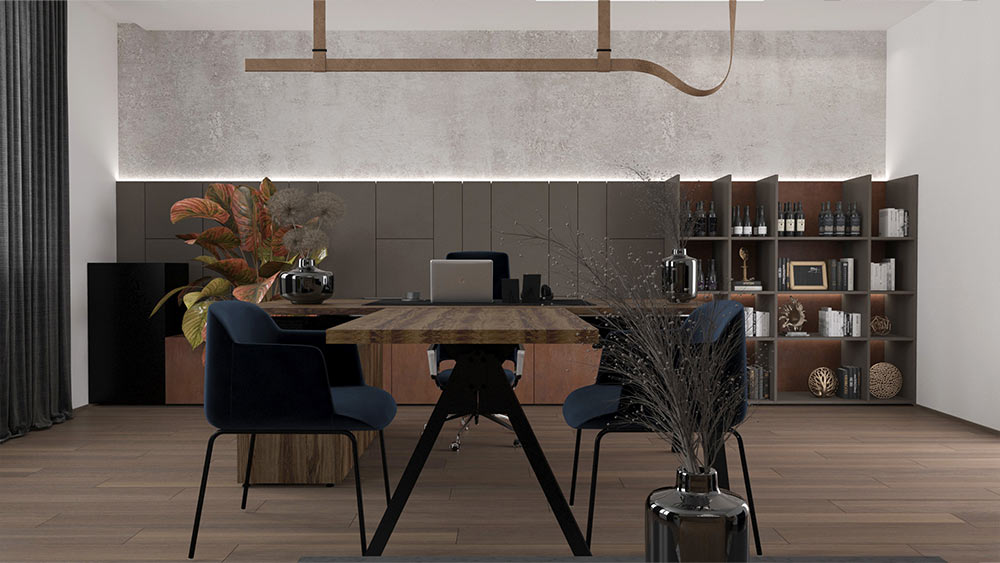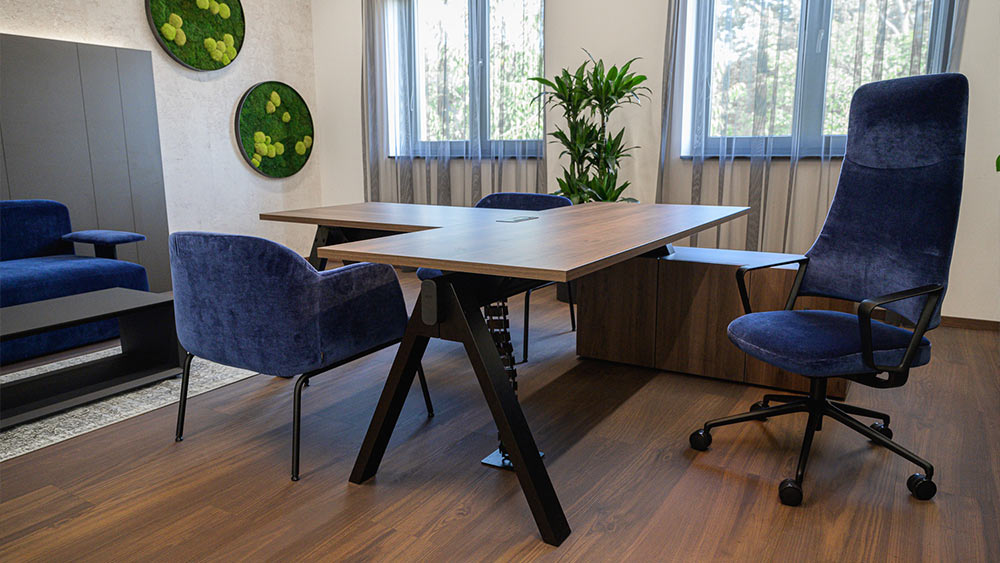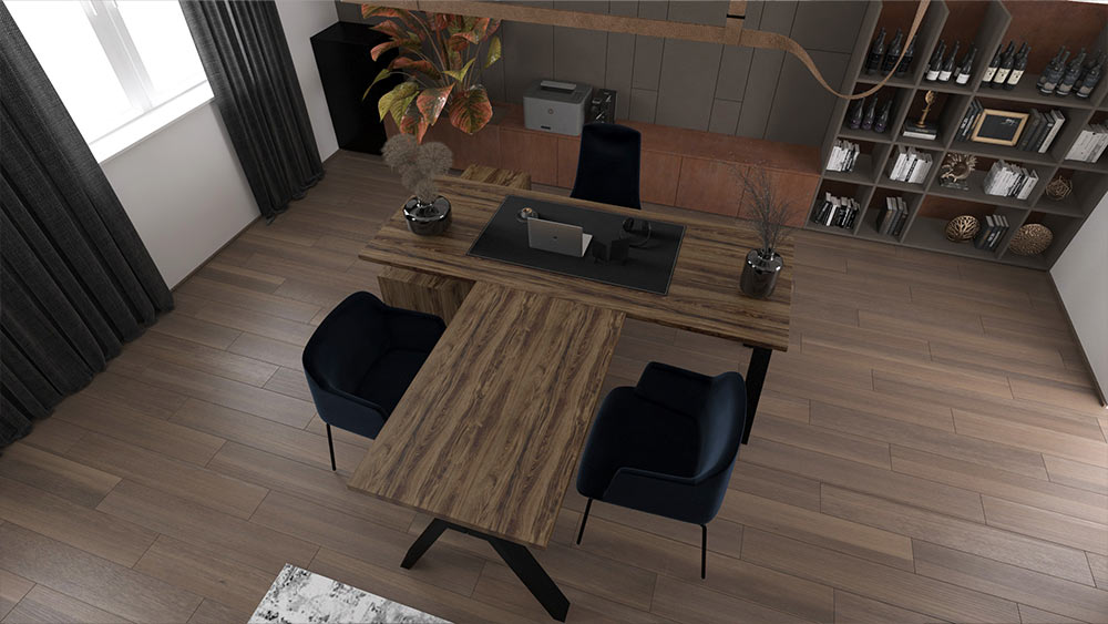 Kancelária riaditeľa s rozlohou 31 m² bola navrhnutá ako reprezentatívny priestor s dôrazom na ergonómiu, prestíž a extravaganciu.