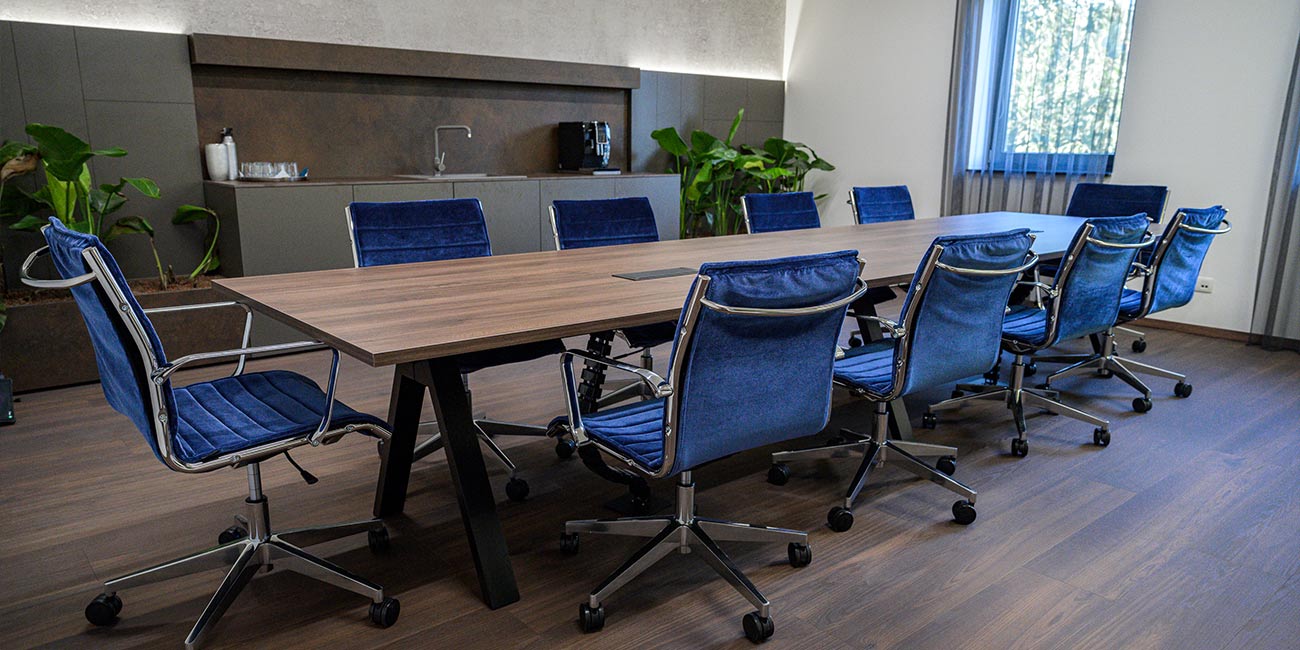 - Konferenčný stôl VIGA: V rovnakom dekore ako manažérsky stôl, elegantné spojenie dizajnov oboch miestností.