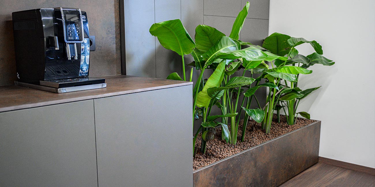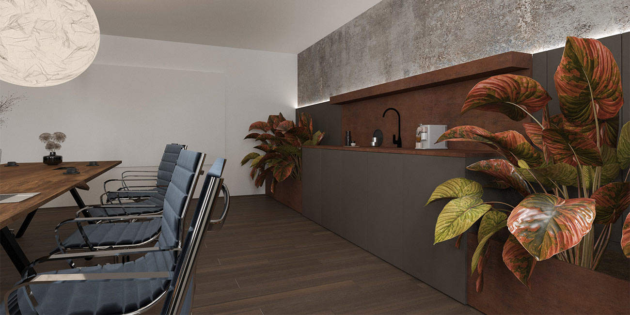 - Interiérové doplnky: 3D svetelné logo, interiérová zeleň, machy, tapety, kuchynská linka, zástena a kvetináče na mieru.