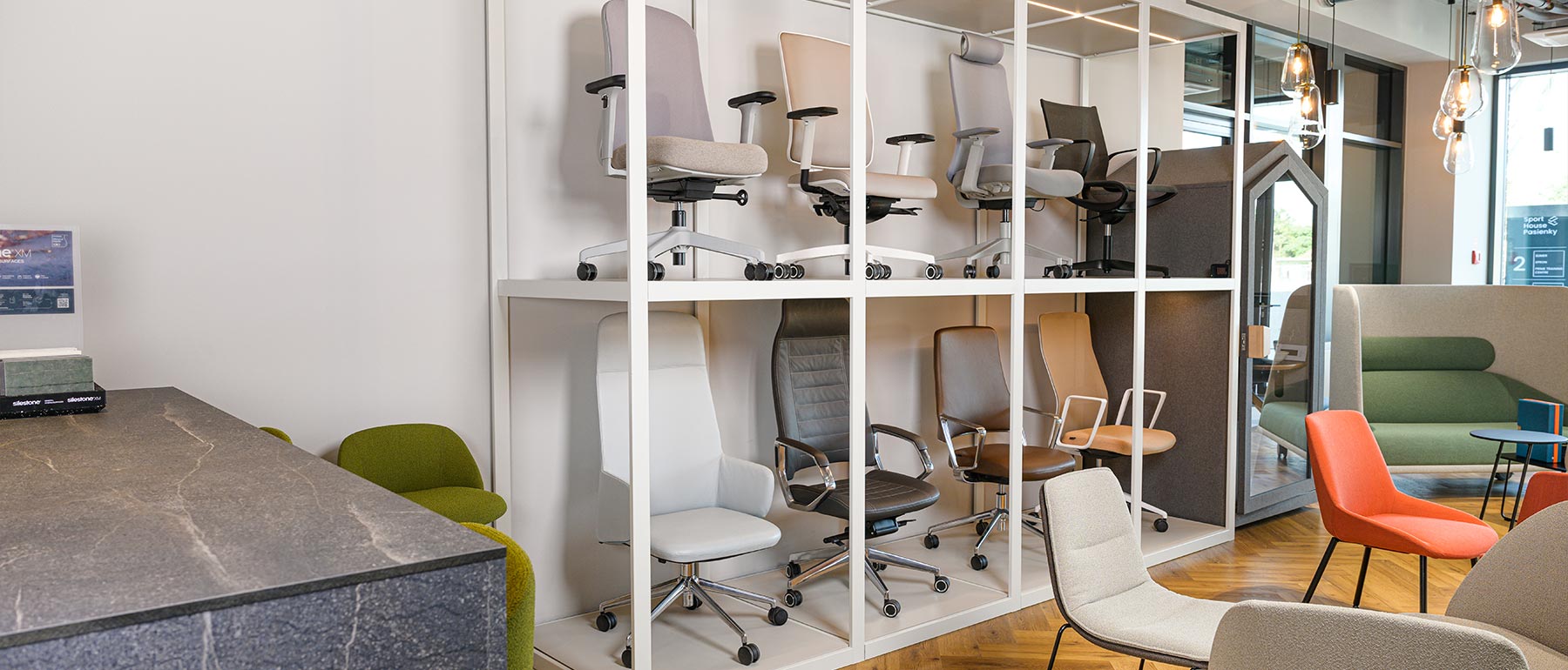U nás si môžete prezrieť a vyskúšať naše produkty, materiály aj aktuálne kolekcie. Výškovo nastaviteľné stoly, ergonomické stoličky, akustická búdka, loungové, barové a jedálenské sedenie a mnoho iného.